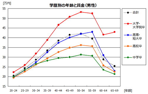 この写真のグラフはネットで(https://kyuuryou.com/w02.html)みつけた2008年のデータと称するもので、正しいかどうか分かりませんが、確かにこんな感じなのは間違いないです。私もサラリーマン時代に会社の年収カーブを見てビックリしました。右肩上がりなのかと思ったら、53歳がピークで下がるんです。そして定年後の再雇用は激減する。そんなわけで個人年金に入ったり、生命保険かけたりしたんですよ。
