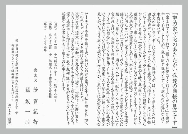 亡くなった芳賀涼大選手はかえって来ない以上、生かされた者はこのロードレースという道を続けるしかない。そのことを参列した全員が感じたことと思います。