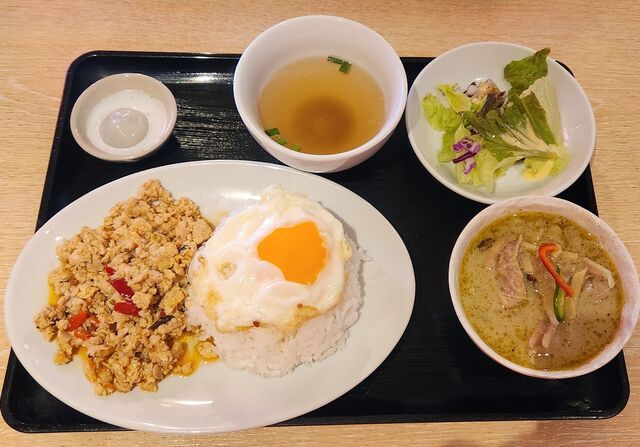 写真は大岡山のタイ料理店「ココナッツシュガー(食べログ)」のランチAセットで、グリーンカレーとガパオにサラダとデザートが付いて確か900円ぐらいです。東急電鉄大岡山駅から徒歩3分ぐらいの距離で、12時前までに入店すればランチタイムも混雑する前に入れることもあり、しかもデザートまで付いて1000円を切るタイ料理店って滅多に無いので、近くにあるサイゼリアのワンコインランチを食べるつもりが、ココに行ってしまうという機会もよくあります。
