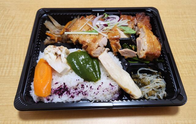 写真の野菜や鶏肉が動いてしまっているのは私の運搬方法がクソだからです。どんなにキレイに仕上がってるお弁当やケーキでも、私が持つと縦になったり転倒したりでグチャっとなるのですが、それについては申し訳ありません。