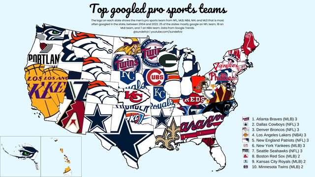 それはさておき、アメリカで4大プロスポーツと呼ばれる物があるのですが、写真は各州でGoogle検索されるプロスポーツをビジュアル化したものです。