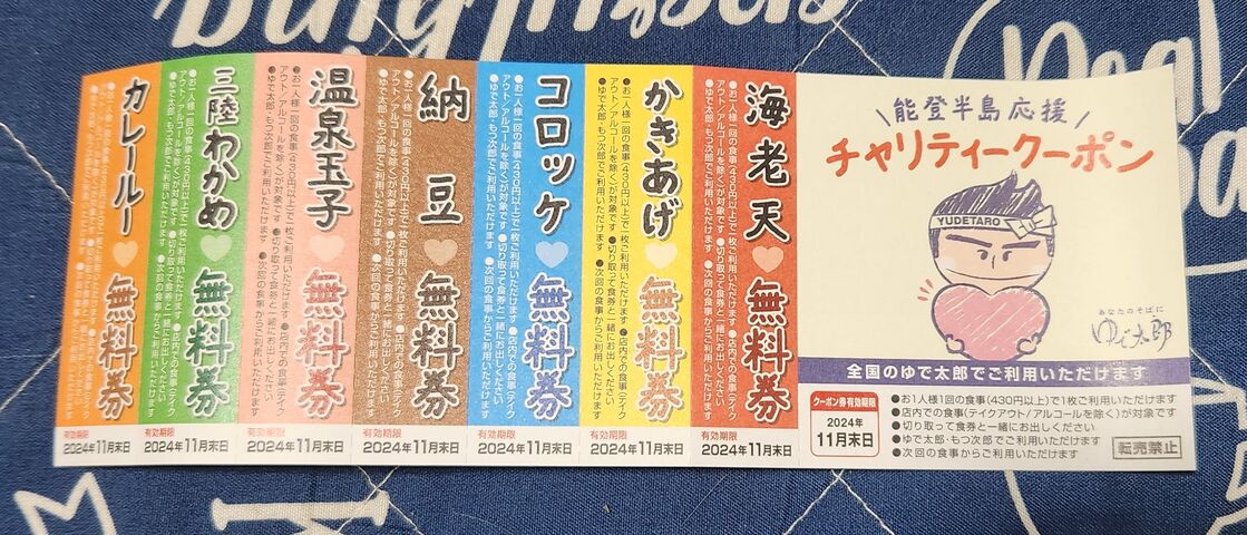 それはさて置き、今までだと単なる「再来同機づけ」として配られていた無料クーポンが、今回は「能登半島応援チャリティークーポン」として募金箱とともに置かれていて「1枚に付き100円以上の募金をお願いします」と書いてありました。