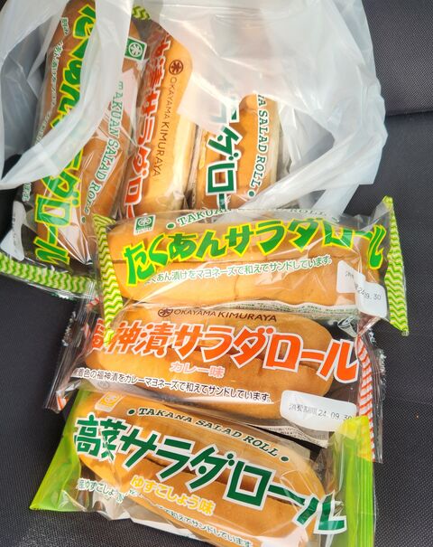 テレビ番組「秘密のケンミンSHOW」でも紹介されたキムラヤの「たくあんサラダロール」をはじめ高菜サラダや福神漬サラダは岡山に来たら絶対外せない菓子パンメニュー。ただ県北部地域にはキムラヤが無いので手に入らないと思われがち。