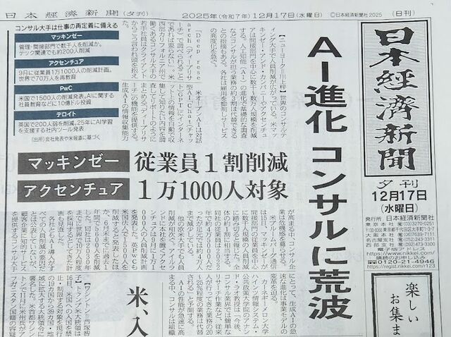 写真は昨日の日本経済新聞夕刊。世界中の大手コンサルがリストラを計画しているとの記事です。理由は「AI」。コンサルに仕事を依頼するクライアント側からすれば「AI以下の人間は社員であっても不要なのにコンサルティングファームから来るAI以下の人間なんてゴミ」ってことであり、先日から私が書いているように私の仕事は消えて無くなるって事と同じ話しだと思います。