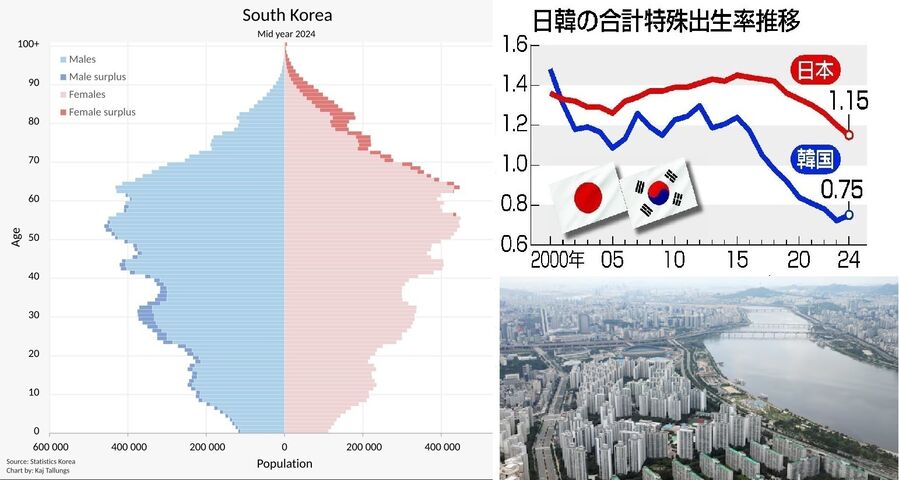 韓国の人口ピラミッドを見ると、衝撃的なレベルで若年層が少ない坪型となっていて、事態の深刻さが良く分かります。ソウル市内は高層マンションだらけで、そのどれもが1億円超えで取引されていますので、数十年後には大量の廃墟高層マンションと大借金を負った労働者層の山が見えるのですが、韓国ではそのような未来予想は出ていないようです。大丈夫か?って俺もお前も。