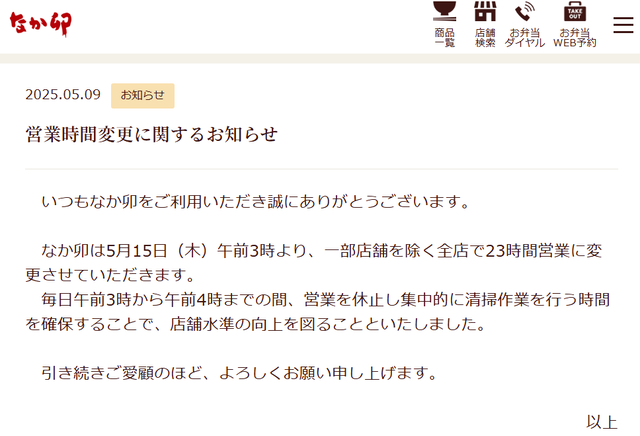 先月4月3日に発表された「すき家の24時間営業の取りやめ」は、3時から4時を清掃時間とするという形で、発表直後の4月5日から実施されています。そして昨日、同じゼンショーグループの「なか卯」でも「5月15日から23時間営業」となることが発表されました。