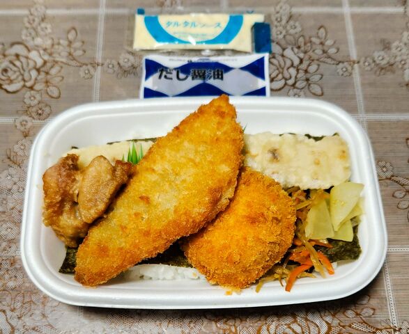 メニュー上は白身フライ/コロッケ/から揚げ/ちくわ天となっていますが、現実にはのり弁なのでおかかがしっかりかけられたご飯の上にはビッシリと海苔が敷き詰められ、さらに切り干し大根と千切りさくら漬けもセットされています。