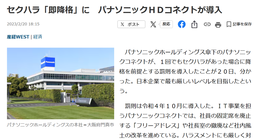 写真は2023年2月のもので、内容は「パナソニックコネクトが1回でもセクハラがあった場合に降格」という制度を2022年10月に導入していたという記事です。この会社はパナソニックグループのIT事業担当をしており、いろんな意味で新しい仕組みを積極的に導入していたようですが、この斬新な試み(なのか?)をまさか上層部に適用することになるとは思わなかったことでしょう。
