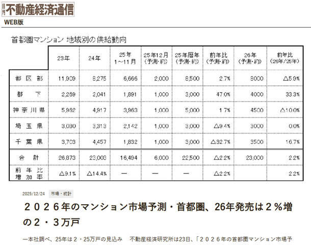 首都圏新築マンション供給戸数2万3000戸