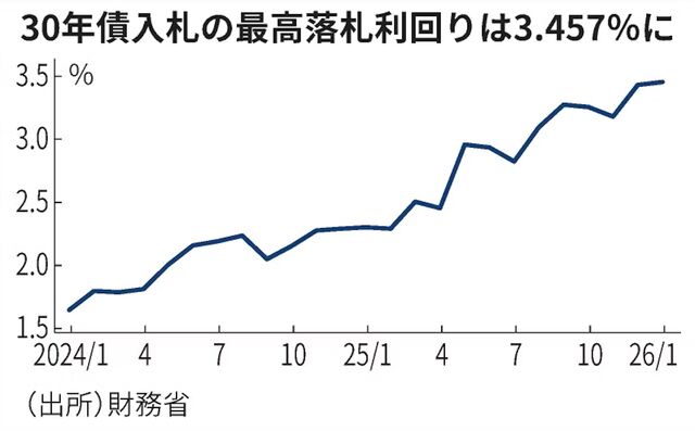 財務省が1月8日に実施した30年物国債入札の最高落札利回りは3.457%。28日の40年債物国債入札の最高落札利回りは3.720%。利払い確実な国債でこんなに儲かるのが実情。