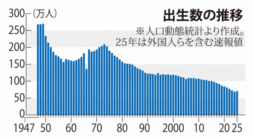昨日、厚生労働省が「2025年の出生数が70万5809人」と発表しました。出生率については厚労省で高位推計/中位推計/低位推計という3種類の予想を立てていて、一番低い低位推計の感じで動いているというのが現状です。国立社会保障・人口問題研究所が、2020(令和2)年の国勢調査確定数を出発点とする「全国将来人口推計令和5年版(PDF)」というのを出しているのですが、2025年の中位推計では「74.9万人で75万人割れもあり得る」という感じでしたが、実績はギリギリ70万人なので、政府の少子高齢化対策は何の役目も果たしていないということなのでしょう。